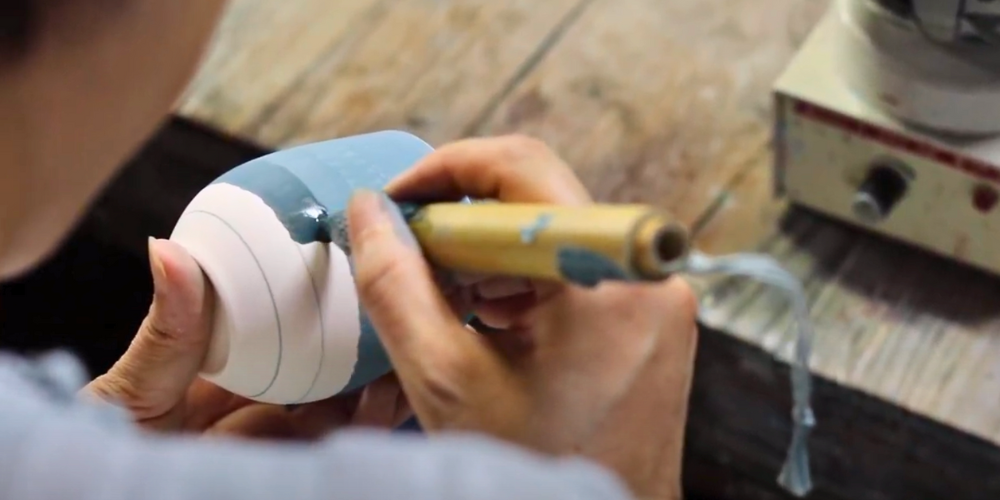 筆にたっぷりと含ませた呉須を細かく塗っていく「濃み」技法。