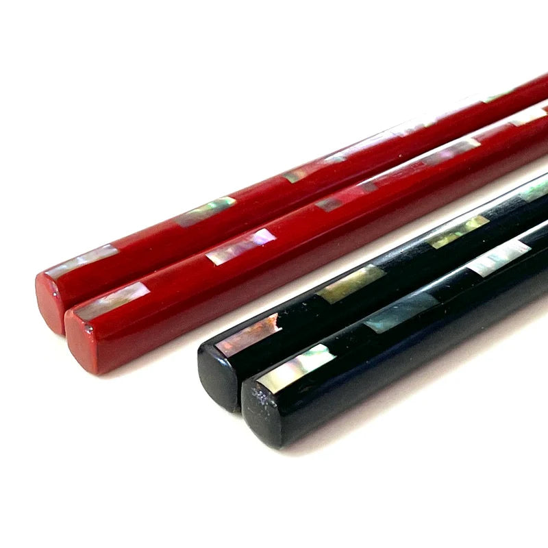 螺鈿と卵殻、金箔、色漆など様々な加飾技法が用いられる若狭塗のお箸。貝による螺鈿装飾は華やかでギフトにもおすすめです。