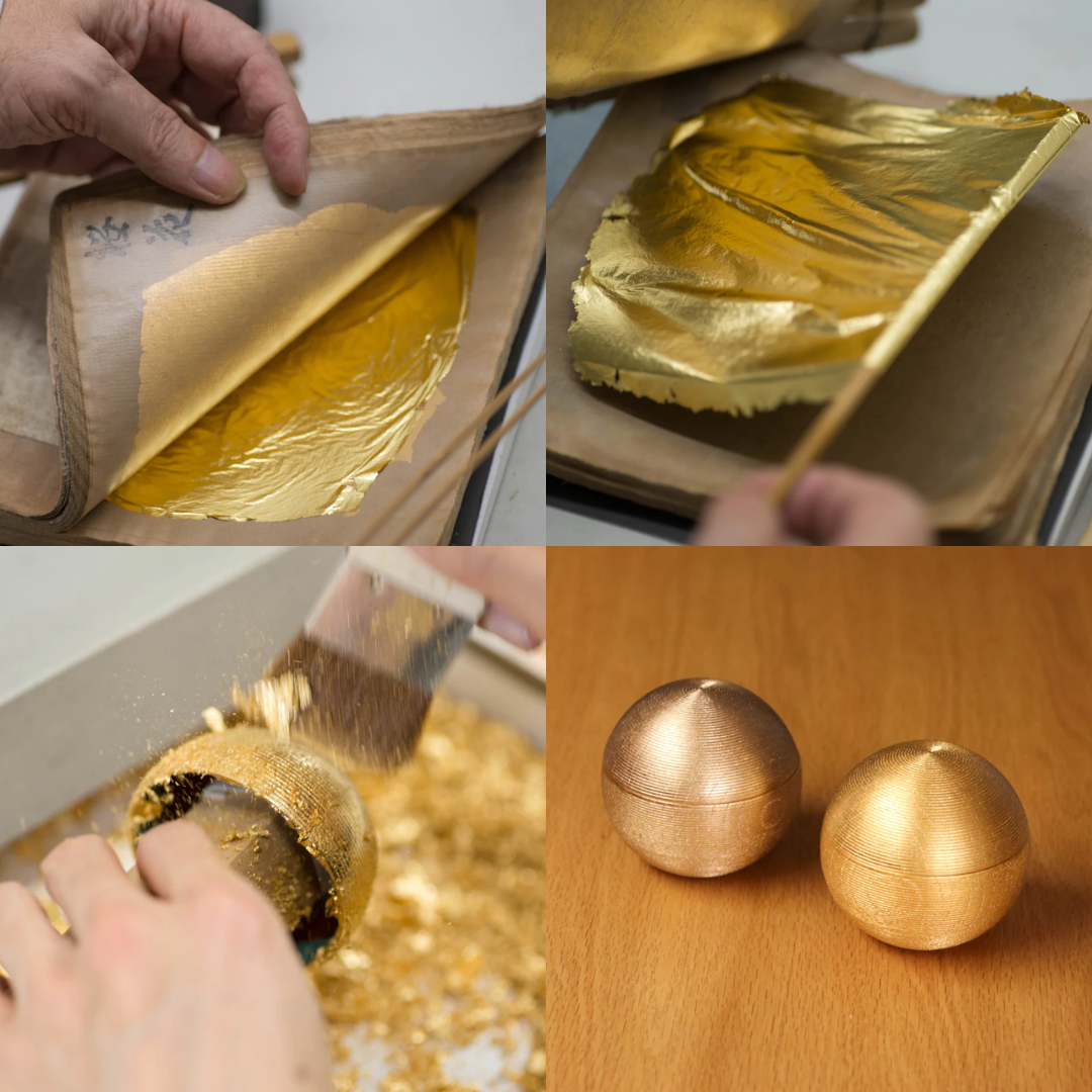 金沢箔の歴史は古く、文禄2年(1593年)に加賀藩初代藩主・前田利家が金・銀箔の製造を命じた書が残っています。箔打ち紙と呼ばれる紙の束の間に金合金を挟み込み打ち延ばしてつくられる箔は、なんと薄さ1万分の1ミリほど。手漉きの和紙を箔打ち紙に用いる製法「縁付金箔」は400年以上の歴史を持ち、ユネスコ無形文化遺産にも登録されています。(>金沢箔のページへ)