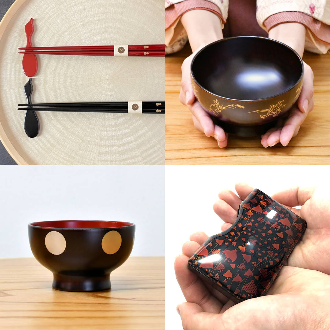 越前漆器は、漆を知り尽くした漆かき(漆を採集する職人)が、自分が使う器に漆を塗ったことに始まる暮らしの漆器。漆をどう使えば器が美しく丈夫になるかを考えて作られています。旅館や飲食店、最近では鯖江市内の小学校の給食用食器などで導入され、身近な暮らしに寄り添う漆器として親しまれています。(>越前漆器のページへ)