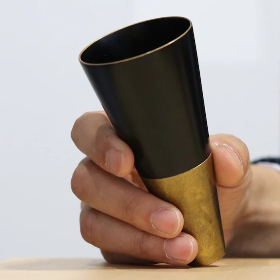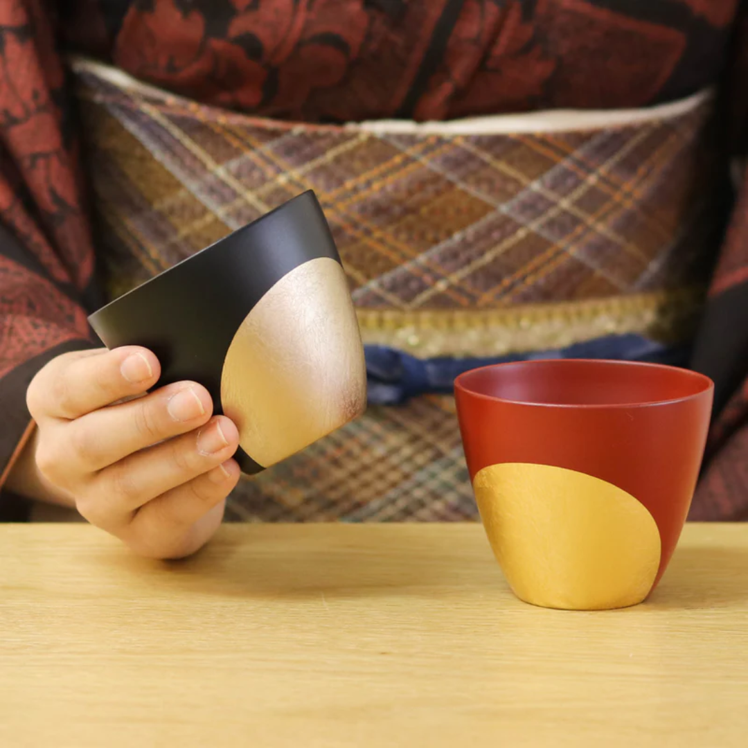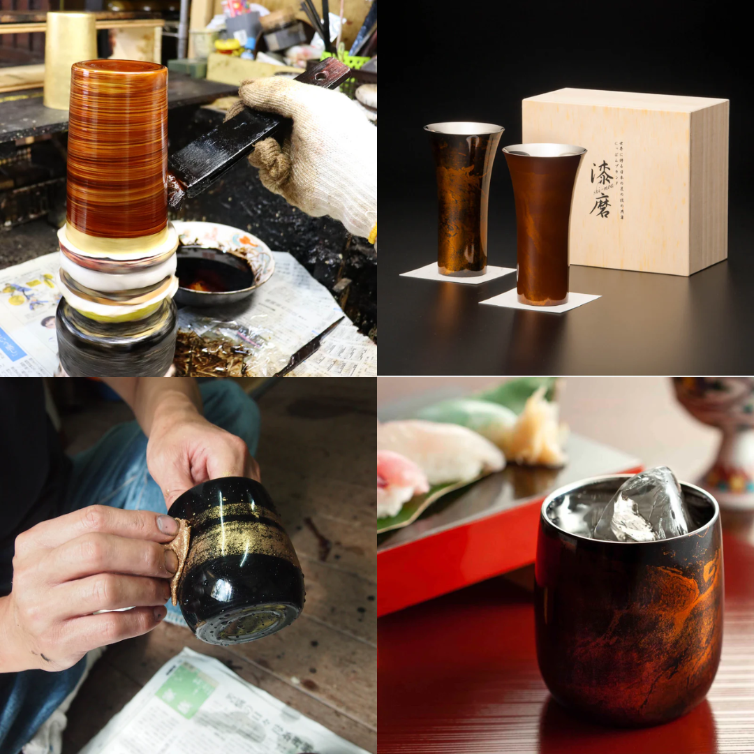 機能的なステンレスの外側に、漆による伝統的な白檀塗が施された「漆磨」カップ。白檀塗は、金銀箔や粉の上から漆を重ねることで、高級感のある、奥深い輝きが美しい技法です。また、漆は経年変化によって色が変化するため、使い込むうちに愛着が湧く素材でもあります。カップの本体は18-8ステンレスで作られ、新潟県燕三条の高い技術力が生かされた内側の加工により、ビールを注ぐ瞬間に美しいクリーミーな泡が生まれます。(>ウチキのページへのページへ)