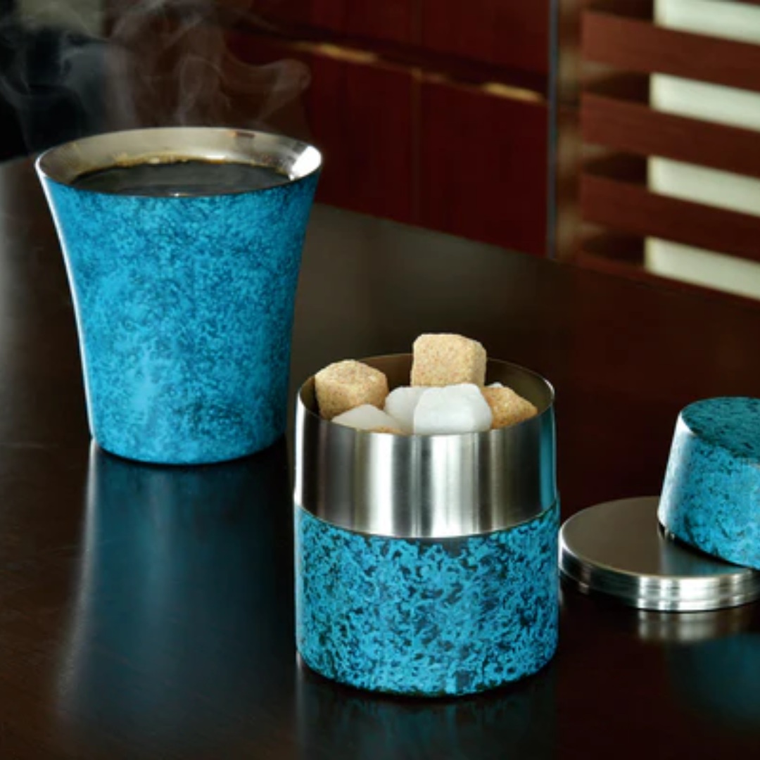 金属加工の町「燕市」の金属製品に高岡銅器の着色技術が加わって生まれた「折燕 ORI-EN」シリーズの二重タンブラー。折燕シリーズと独特の模様を生み出しているのは、高岡銅器の伝統技術である「腐食による着色」技術。特殊な液体に浸し、金属表面を腐食させて鮮やかな色彩を引き出す技術は、銅や真鍮を加工するものでした。その技術をステンレスで表現することは至難の業。それでも2つの産地の職人はあきらめることなく挑戦し続け、ステンレスに特殊な技術で同を着色し、高岡銅器の技術で着色することに成功しました。(>アルチザンのページへ)
