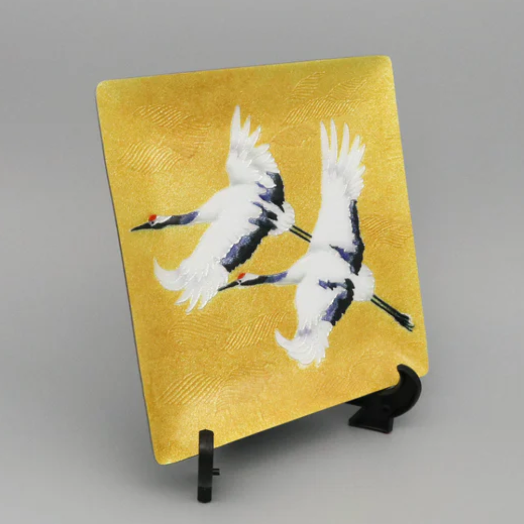 金の空に双鶴が舞う、縁起の良い七宝焼の飾皿。鶴は長寿の象徴。(¥13,750~)