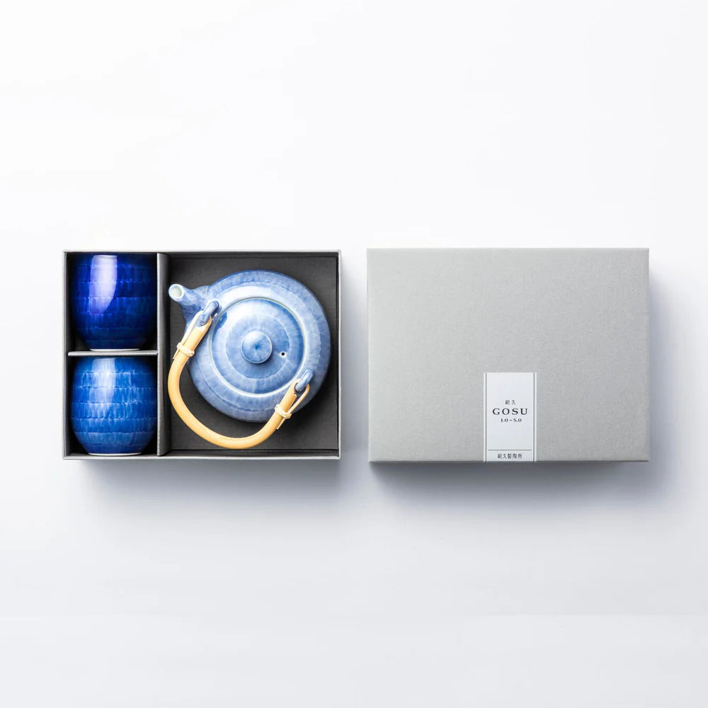 青色の濃淡が選べる肥前吉田焼GOSUシリーズ。土瓶とペア湯吞のセットは夫婦への贈り物に人気です。(¥19,800~)