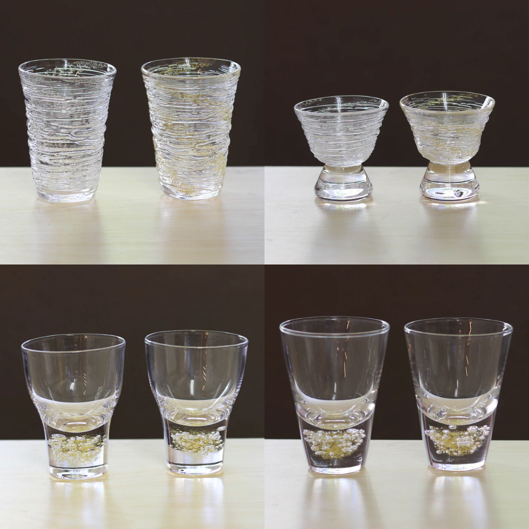 日本独自の伝統技法「縁付金箔」で作られた金箔を閉じ込めたグラスです。