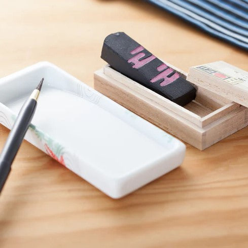 硯、彩墨、筆、スポンジ・プラスチックケース、収納箱の5点セット。有田焼の硯、鈴鹿墨、熊野筆が使われているこだわりの組み合わせです。