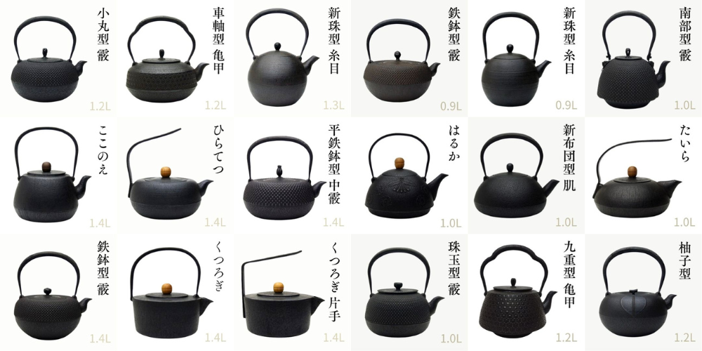 薫山工房で作られる南部鉄瓶は、種類の豊富さが特徴です。鉄鉢型や南部型、棗型と呼ばれる一般的な形状だけでなく、車軸型や柚子型、新布団型など、他ではあまり見られない形の鉄瓶も多く揃います。