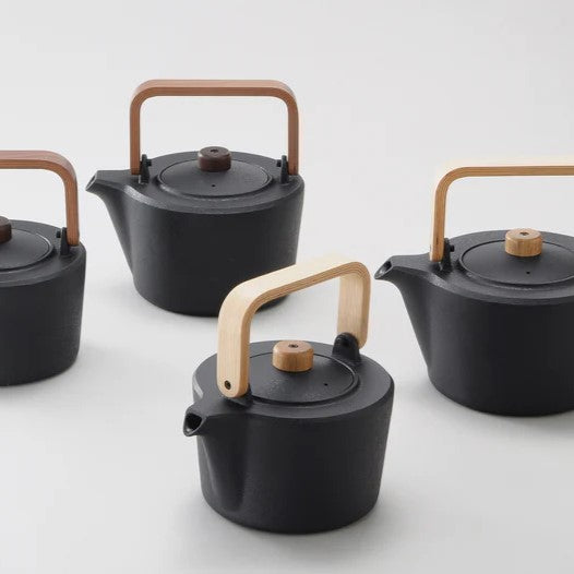 和のイメージが強い鉄瓶ですが、この鉄瓶はそのイメージを覆す、洋の暮らしにもしっくりとなじむシンプルモダンな木のハンドルの「ケトル」です。内部に施されているのは伝統的な鉄瓶づくりの技、漆の焼付仕上げ。鉄瓶の大きな魅力である鉄分補給を妨げません。それだけでなく、「日々使いたい」と思ってもらえるよう、IH調理器でも使えるフラットな底、吹きこぼれしにくい注ぎ口の位置だけでなく、お湯を注ぎやすい三角形の注ぎ口など細部にこだわっています。