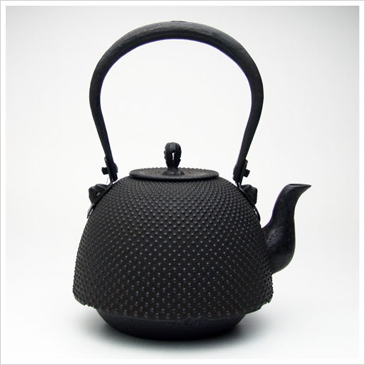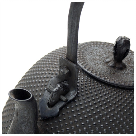 蓋のつまみも鉉(つる)もすべて鉄で作られた鉄瓶は、長く薫山工房で作られ、多くの人に愛用されてきた商品。南部鉄器を代表する形の1つが「南部」です。煎茶道の湯沸かしとして愛用されてきた形でもあります。底部分に段があるので、表面が熱で傷むのを予防でき、ガスで使いたい方にもおすすめです。表面の丸い小さな粒は、南部鉄瓶に最も多い霰(アラレ)模様。規則的に並んだ丸い粒は職人が一つひとつ手作業で描いています。